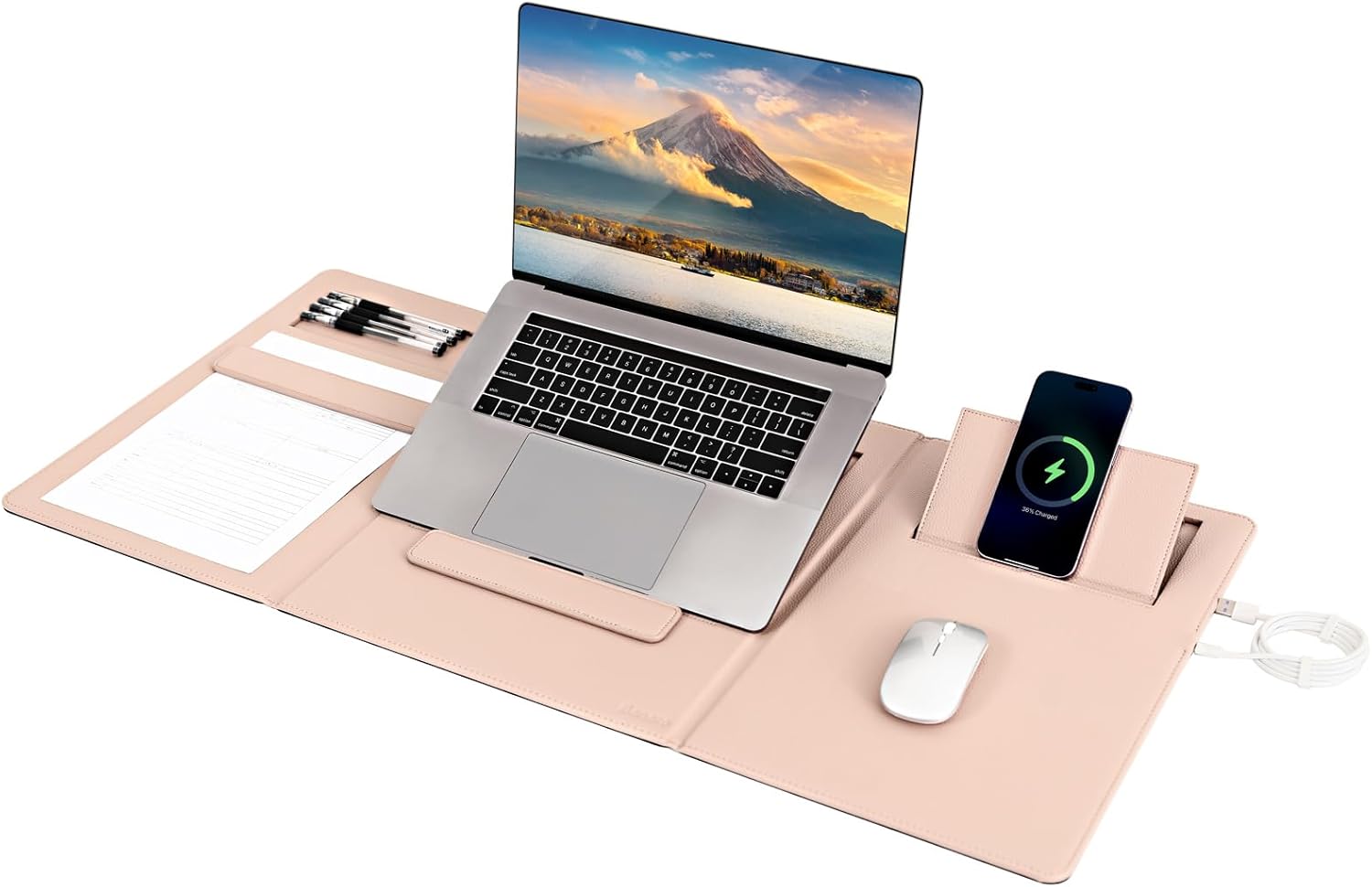 4-in-1 Laptop Stand for Desk Built-in Wireless Charging Pad, 15W, Qi-Certified, PU Leather Wireless Charging Mouse Pad, Laptop Holder on Top of Desks for Office