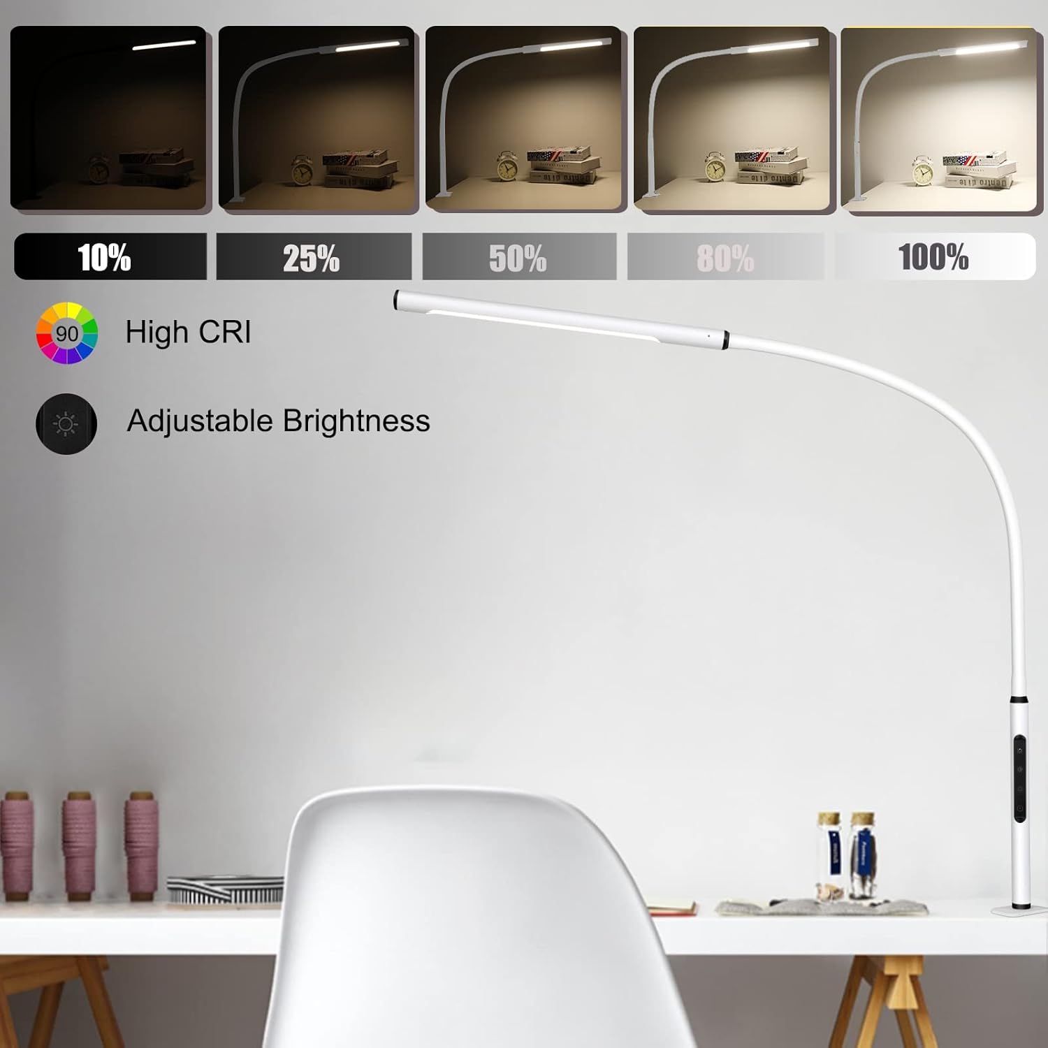 Our desk lamp comes with multiple lighting modes, warm white light being natural, warm yellow light being cozy, and cool white light being bright. The gooseneck desk lamp totally satisfies your lighting needs in reading, working, thinking, relaxing, drawing, knitting, sewing, hobby, handicrafts, manicure, etc